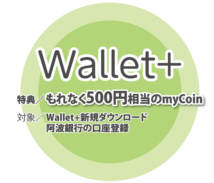 本キャンペーンは阿波銀行が主催するキャンペーンです。阿波銀行以外の銀行口座を登録した場合、本キャンペーンは適用されません。本キャンペーンはWallet+ からのエントリーが必要です。エントリーはお一人さま「1回」限りとなります。対象者には、2026年12月中にキャンペーン特典の進呈を予定しています。キャン ペーン特典を受領する前にWallet+を退会もしくは口座解約等対象取引の継続が確認できなかった場合、特典付与の対象外となります。特典受領の権利の第三者 への譲渡、換金などはできません。その他不正な手段により本キャンペーンに参加したと当行が判断した場合には、応募の取り消しなどの対応をとることがあります。 本キャンペーンの参加にかかるスマートフォンの通信料は参加者が負担するものとします。本キャンペーンは事前の予告なしに中止、変更される場合があります。当 キャンペーンの特典は課税対象となる場合があります。くわしくは所管税務署等にご相談ください。