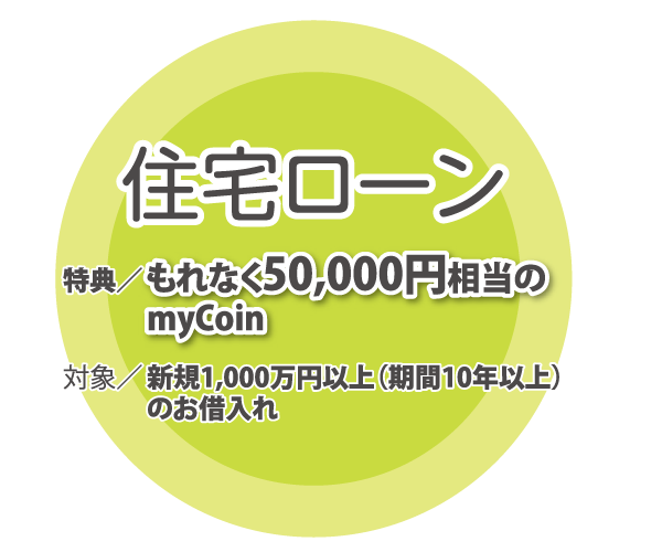 <留意事項>特典付与は1世帯あたり1回限りとさせていただきます。無担保型総合住宅ローン、フラット35および当行住宅ローンの借換は対象外となります。お申 込に際しては、所定の審査があります。審査の結果、ご希望に添えない場合がありますのでご了承ください。