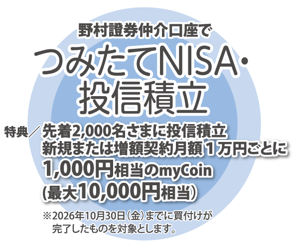 ●当行が金融商品仲介業務でお取扱いする商品の購入にあたっては、当行を通じて野村證券株式会社、大和証券株式会社、四国アライアンス証券株式会社および株式会社SBI証券に「証券総合口座」を開設いただく必要があります。●当行が金融商品仲介業務で取扱う商品は預金ではなく、預金保険制度の対象外です。●当行が金融商品仲介業務で取扱う商品は、投資元本および利回り・配当が保証されている商品ではありません。●金融商品仲介業務で取扱う有価証券等は、金利・為替・株式相場等の変動や、有価証券の発行者の業務または財産の状況の変化等により価格が下落し、損失が生じるおそれがあります。また、お取引による損益は、お客さまご自身に帰属します。●金融商品仲介業務で取扱う商品のお取引は、金融商品取引法第37条の6(書面による契約解除)の規定の適用(いわゆる「クーリング・オフ」の適用)はありません。●委託金融商品取引業者の商品であっても、当行がお取扱いをしていないものがあります。●お客さまの金融商品仲介口座は委託金融商品取引業者に開設され、口座開設後の有価証券の売買等のお取引についても、お客さまと委託金融商品取引業者のお取引になります。●お客さまの有価証券等は委託金融商品取引業者に開設された口座でお預かりのうえ、委託金融商品取引業者の資産とは分別して保管されますので、委託金融商品取引業者が破綻した際にも委託金融商品取引業者の整理・処分等に流用されることなく、原則として全額保護されます。万一、一部不足が生じた場合等全額の返還ができないケースが発生した場合でも、投資者保護基金により、お一人あたり1,000万円までが保護されます。●金融商品仲介口座におけるお客さまの属性や取引関係情報は、お客さまが口座を開設する委託金融商品取引業者と当行で共有します。ただし、金融商品仲介口座以外の取引情報については、委託金融商品取引業者と当行で共有することはございません。●当行において金融商品仲介業務でのお取引の有無が、お客さまの当行における他のお取引に影響を与えることは一切ありません。また、当行での預金・融資等のお取引内容が金融商品仲介業務でのお取引に影響を与えることはありません。●お申込みにあたっては、原則ご本人さまのお手続きとさせていただいております。●委託金融商品取引業者で取扱う商品等へのご投資には、各商品等に所定の手数料等[国内株式取引の場合は約定代金に対して最大1.430%<税込>(20万円以下の場合は2,860円<税込>)の売買手数料、投資信託の場合は銘柄ごとに設定された販売手数料および信託報酬等の諸経費等]をご負担いただく場合があります。●また、各商品等には価格の変動等による損失が生じるおそれがあります。商品ごとに手数料およびリスクは異なりますので、商品のご検討、お申込みにあたっては、必ず事前に商品ごとの契約締結前交付書面、上場有価証券等書面、目論見書等をご確認のうえ、ご自身でご判断ください。●委託金融商品取引業者 商号等/野村證券株式会社 金融商品取引業者 関東財務局長(金商)第142号 加入協会/日本証券業協会、一般社団法人 日本投資顧問業協会、一般社団法人 金融先物取引業協会、一般社団法人 第二種金融商品取引業協会●委託金融商品取引業者 商号等/大和証券株式会社 金融商品取引業者 関東財務局長(金商)第108号 加入協会/日本証券業協会、一般社団法人 日本 投資顧問業協会、一般社団法人 金融先物取引業協会、一般社団法人 第二種金融商品取引業協会、一般社団法人 日本STO協会●委託金融商品取引業者 商号等/四国アライアンス証券株式会社 金融商品取引業者 四国財務局長(金商)第21号 加入協会/日本証券業協会●委託金融商品取引業者 商号等/株式会社SBI証券 金融商品取引業者 関東財務局長(金商)第44号 加入協会/日本証券業協会、一般社団法人 金融先物取引業協会、一般社団法人 第二種金融商品取引業協会、一般社団法人 日本STO協会、日本商品先物取引協会、一般社団法人 日本暗号資産等取引業協会 <投資信託に関するご留意事項>●当行では、金融商品仲介業務(金融商品取引業者からの委託を受けて取引の仲介を行う業務)として投資信託のお取扱いをしています。●投資信託のお申込み(一部の投資信託はご換金)にあたっては、お申込み金額に対して最大5.5%(税込)の購入時手数料(換金時手数料)をいただきます。●換金時に直接ご負担いただく費用として、換金時の基準価額に対して最大2.0%の信託財産留保額をご負担いただく場合があります。●投資信託の保有期間中に間接的にご負担いただく費用として、国内投資信託の場合には、信託財産の純資産総額に対する運用管理費用(信託報酬)(最大5.5%(税込・年率))のほか、運用成績に応じた成功報酬をご負担いただく場合があります。●その他の費用を間接的にご負担いただく場合があります。●外国投資信託の場合も同様に、運用会社報酬等の名目で、保