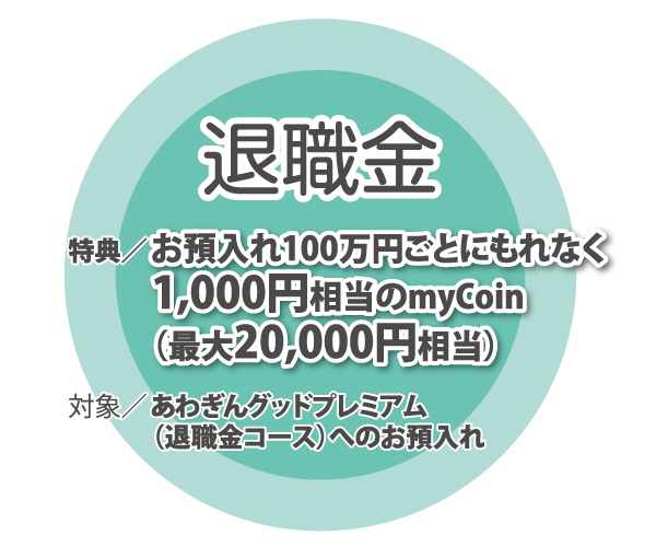 <留意事項>「あわぎんグッドプレミアム(退職金コース)」は中途解約制限特約付 自由金利型定期預金(M型)です。詳細は商品概要説明書をご覧ください。