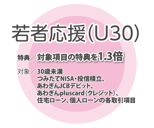 <留意事項>判定は自動で行い、つみたてNISA・投信積立、あわぎんJCBデビット、 あわぎんpluscard(クレジット)、住宅ローン、個人ローンの各取引項目については特典を1.3倍して進呈します。