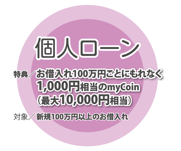 <留意事項>カードローンおよび当行内での借換は対象外となります。特典はお借入額100万円ごとに付与し、他商品とお借入額の合算はしません。お申込に際しては、所定の審査があります。審査の結果、ご希望に添えない場合がありますのでご了承ください。